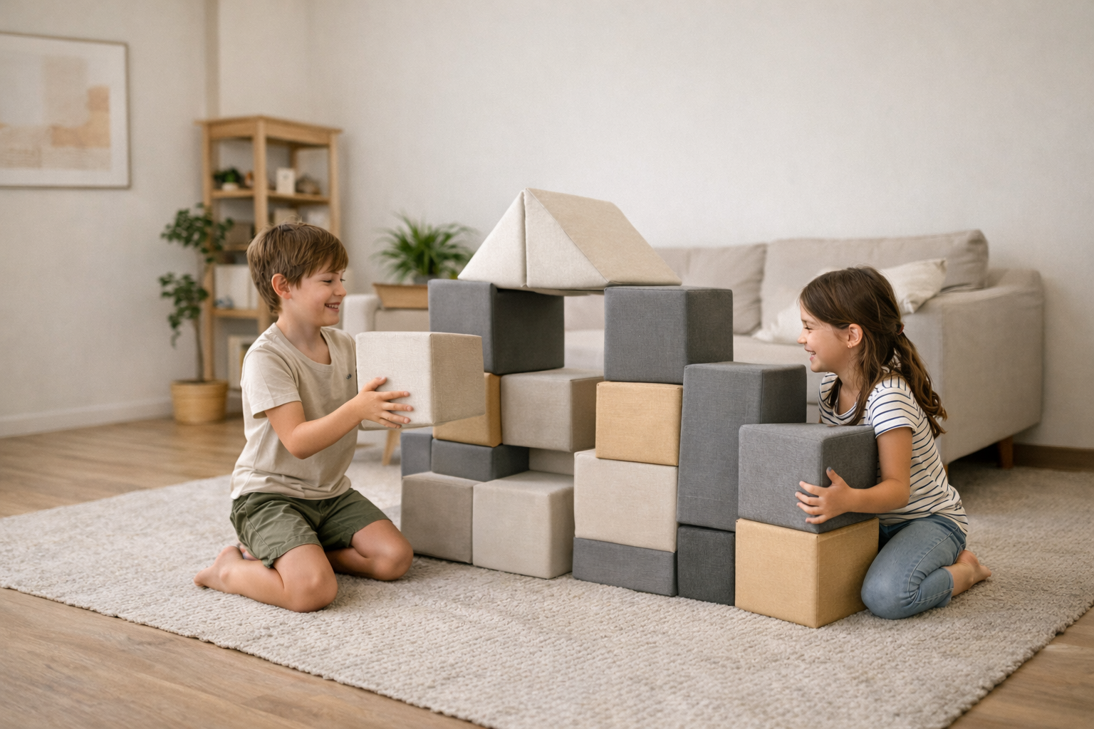 Un cubo blando de 40 cm que suma estructura al juego en el suelo: funciona como asiento bajo, apoyo y “pieza base” para construir. Se integra fácil al hogar y se limpia sin complicaciones.